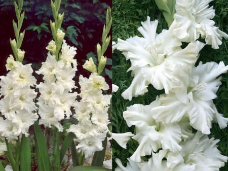 Рост гладиолус Сноу Фриззл имеет до 130см. Цветки крупные, с гофрировкой, белоснежные, со слегка зеленоватой серединкой, одновременно в роспуске их 7-8, двурядно. Покупая луковицы гладиолуса Snowy Frizzle, не усомнитесь, что в задуманных для них точках сада и на любом цветнике они будут незаменимым акцентом или фоном. Так как белый чистейший цвет, которым так богат гладиолус этого сорта, идеально включается в компанию с любым тоном, оттеняя и усиливая его эффект, создавая ощущение свежести и морозной чистоты.
