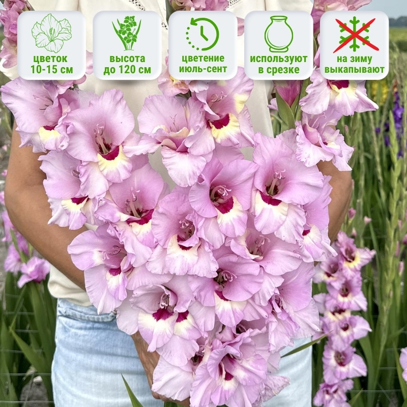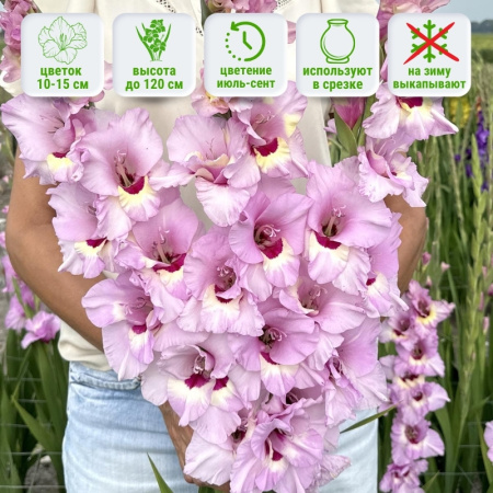 Вырастает на высоту около 100-120 см, его стебли стройные и прочные, а листья мечевидные, тёмно-зелёные, подчёркивают эстетику цвета соцветий. Цветы у него крупные, диаметром примерно 10–15 см, с богатой, утончённой окраской: лавандовый или розово-лиловый фон украшен малиновым язычком, переходящим в кремовый на нижнем лепестке бутона, благодаря чему соцветия не сливаются, а оживают. Цветение наступает через 90 дней после посадки и радует глаз в разгар лета в июле-сентябре, в зависимости от климатической зоны и сроков посадки. Может присутствовать слабый аромат.Универсальность и применение в саду: