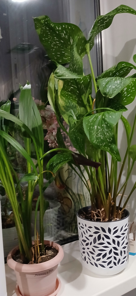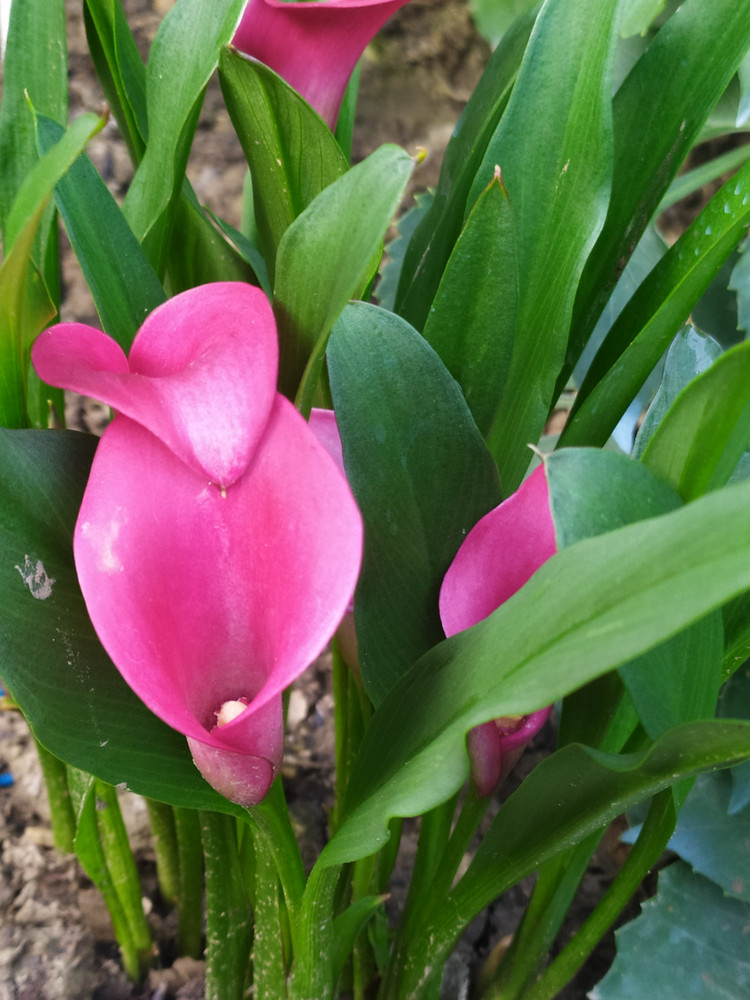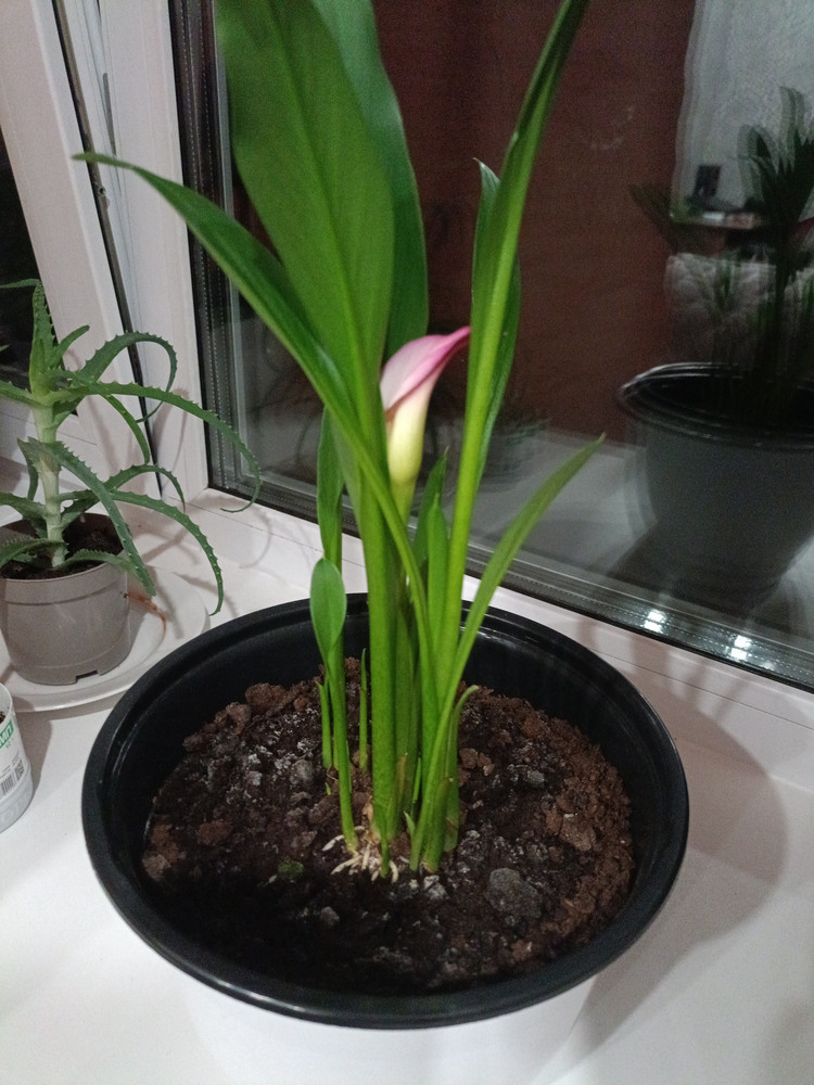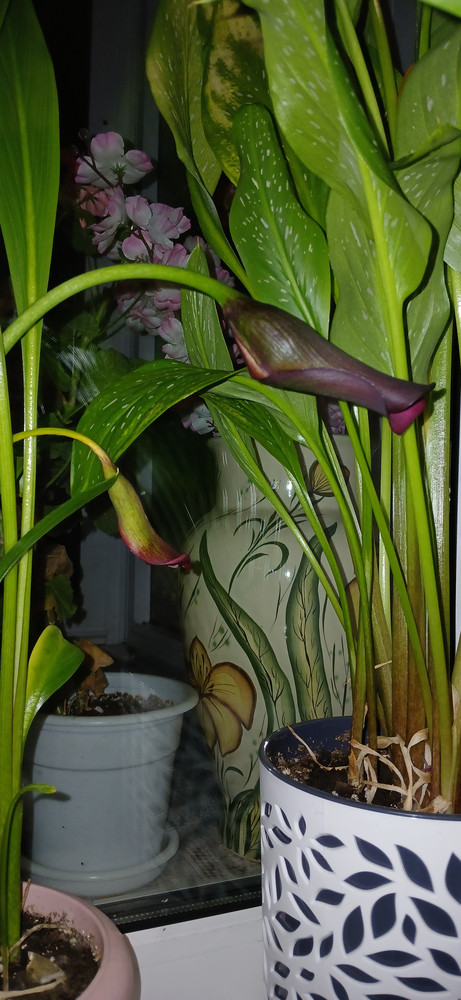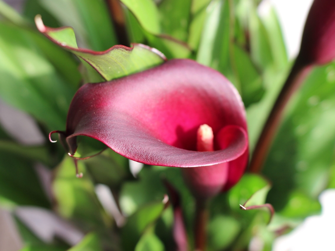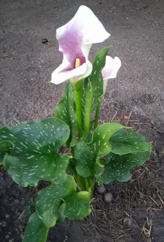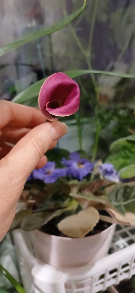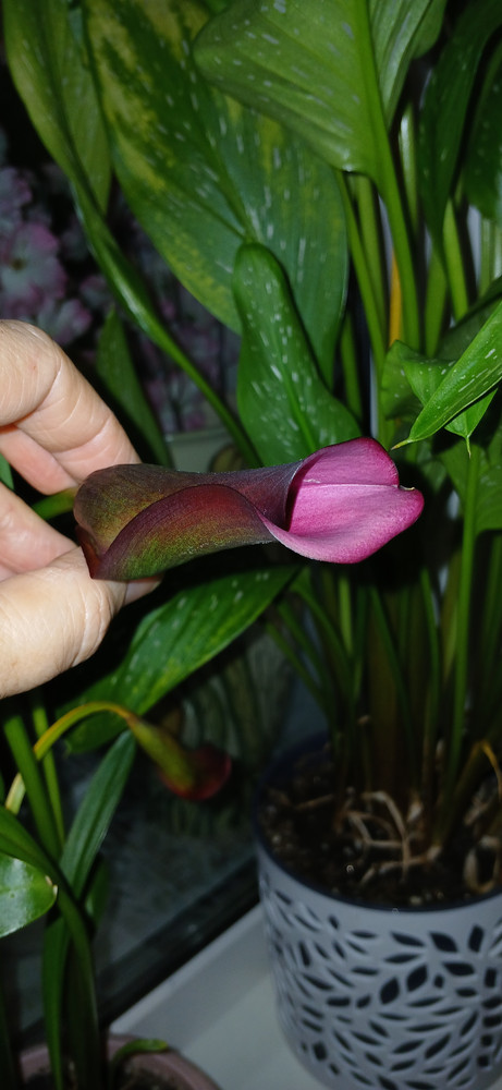И даже листья zantedeschia Macau не смогли устоять под натиском пигмента! Они полностью перекрасились в бордовый у основания и протяженной линией по канту, а также с обратной стороны присутствует расплывчатая дымка поверх зеленой глади. Наружная сторона всё также преимущественно зеленая с мелкой белой рябью. Высота взрослого растения 60 см.