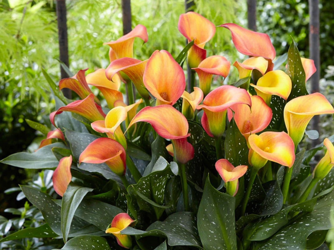 Высота растения, достигающая 60 сантиметров, слегка приподымает его над остальными цветами. Листья каллы Morning Sun зеленые, широколопастные с мелкими брызгами-точками, создают плотный фон, на котором цветочная шапка выглядит наиболее выигрышно.