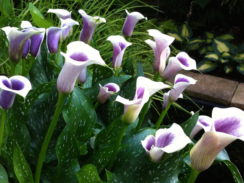 Время цветения каллы Пикассо приходится на июнь-сентябрь, образуя эффектные цветы нежно-сиреневого оттенка с пурпурно-сиреневым горлом и молочно-белой широкой каймой. Высота цветка 12-15 см, диаметр 7-10 см. Продолжительность цветения каждого цветоноса 20-30 дней.