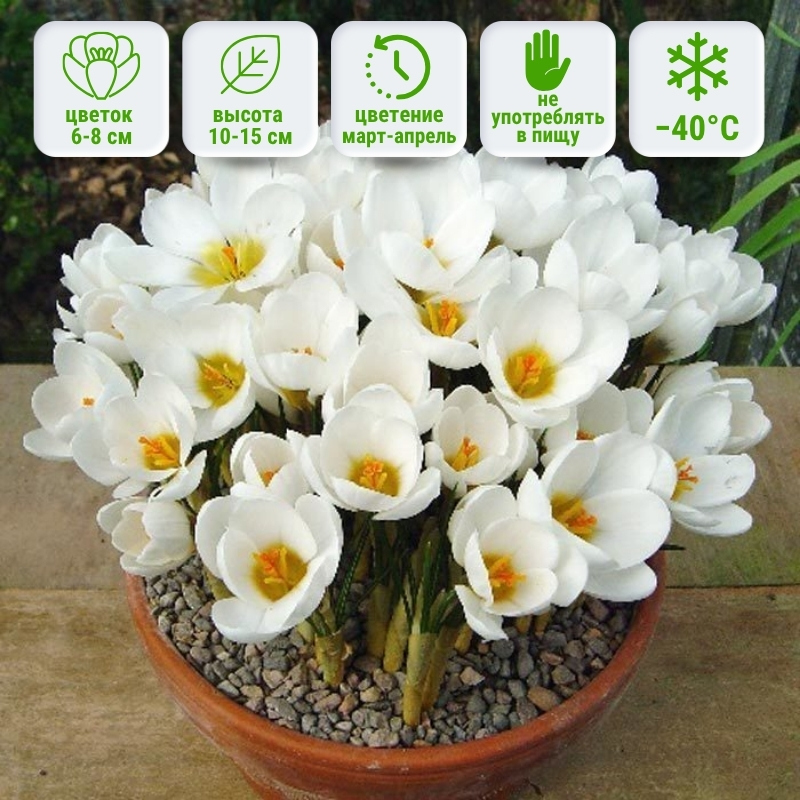 Ботанический крокус Aubade (Аубад)— один из лучших сортов белого крокуса, как только сходит снег он тут же начинает украшать Ваш сад, принося нотки весны одновременно с ландышами. Идеальны ботанические крокусы Аубад в качестве горшечного растения, являются отличным живым подарком для женщин на 8 марта.