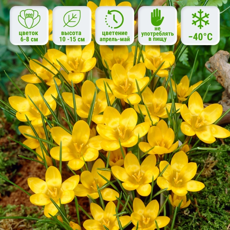 Период цветения крокуса Дороти приходится на март-апрель, образуя на тонком цветоносе крупный бутон насыщенно-желтого оттенка с темно-коричневыми штрихами по внешней стороне нежных лепестков. На протяжении 8-10 дней восхитительный крокус подарит вам яркое весеннее цветение чаруя тонким сладким ароматом. Высота крокуса Dorothy достигает 10-15 см, с тонкими, узкими темно-зелеными листьями, которые сохраняют свою декоративность на протяжении всего вегетационного периода. Идеальны ботанические крокусы в качестве горшечного растения, являются отличным живым подарком для женщин на 8 марта.