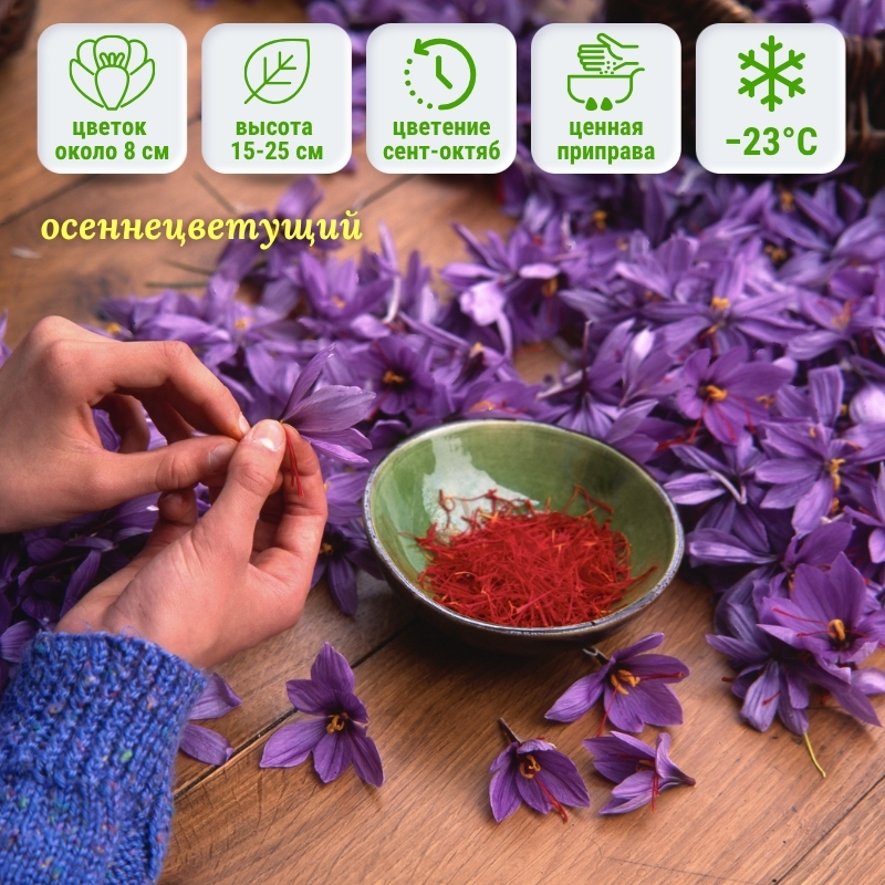 Период цветения крокуса (шафрана) Сативус приходится на сентябрь-октябрь, образуя на прочном стебле крупный бокал нежно-фиолетового оттенка с бордовыми, тонкими прожилками по всему лепестку, а при роспуске открывает в сердцевине черную пуговку с оранжевыми тычинками и причудливыми, длинными рыльцами ярко-красного оттенка. Яркие тычинки крокуса обладают известными качествами, из них получается великолепная кухонная добавка шафран. Высота бокала 4-5 см с чудесным сладким ароматом. Продолжительность цветения 8-10 дней сохраняя первозданную свежесть. Высота очаровательного крокуса (шафрана) Сативус 10-15 см с прикорневыми темно-зелеными листьями. Великолепно смотрится в групповых посадках, превосходно украсит альпийскую горку, миниатюрные клумбы, а также прекрасно подходит для горшечного выращивания.
