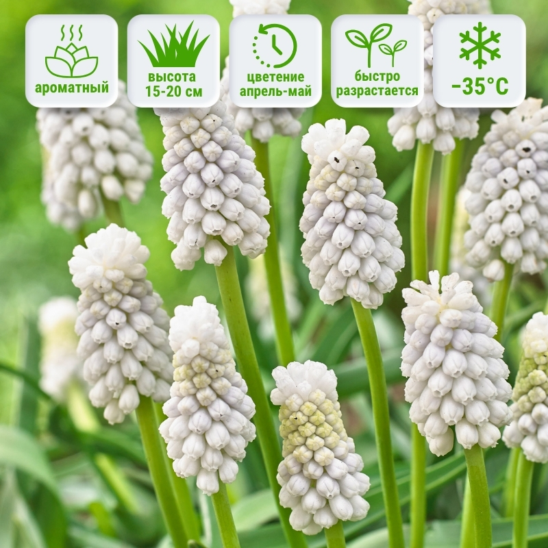 Его легко выращивать и он способен оживить любой весенний пейзаж благодаря своим ярким и густым соцветиям. Мускари Siberian Tiger — это многолетнее луковичное растение, достигающее высоты 15-20 см. Он формирует густые пирамидки из белых цветков, которые напоминают маленькие колокольчики, собранные в плотные соцветия. Цветение начинается в середине весны и продолжается около трех недель. Листья у этого мускари узкие, линейные, насыщенно-зеленого цвета.Где в саду высаживать и с какими растениями использовать: