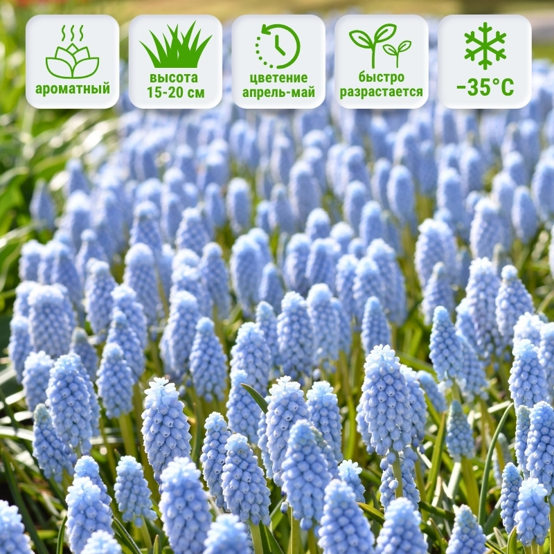 Жемчужно-голубой цвет мускари Валери Финнис придаёт клумбе светской роскоши. Выровненные цветки словно бубенцы, звенящие на погремушке, плотно заполняют вершину стебля. Главным украшением этого цветка, помимо цвета, является яркий аромат. Зацветает позже других сортов, данный факт позволить продлить цветение Вашей весенней клумбы.