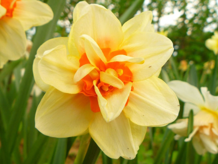 Махровый нарцисс Инноватор цветет в средние для этого вида сроки, в апреле-мае. Цветоносы высотой от 30 до 50см несут медово-желтые цветки размером 8-9см с красной разрезной коронкой-набивкой. Аромат тонкий и нежный.
