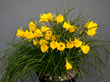 Начать описание это цветка стоит с того, что это мини-нарцисс. Всего 15 см очарования, но какого! Мини-нарцисс Голден Беллс имеет необычный цветок, горлышко-граммофон и чашечку-звезду у основания. Листва игольчатая, очень тонкая и многочисленная. Расцвет приходится на самое начало весны апрель, в некоторых северных регионах май.