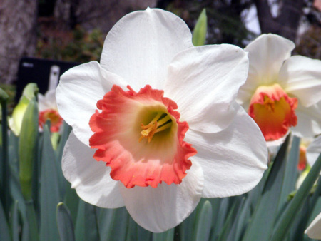 Неповторимое сочетание белоснежного цвета лепестков с абрикосово- красным, волнистым краем коронки. Сорт нарциссов Пинк Шарм относится к крупнокорончатым. Главной особенностью данного цветка является цветение сразу двух цветков на одном стебле. Это придаёт саду двойной, по степени насыщенности, аромат. Стебель нарцисса Pink Charm вырастает до 45 см, на вершине которого образуется бутон диаметром 10-12 см.