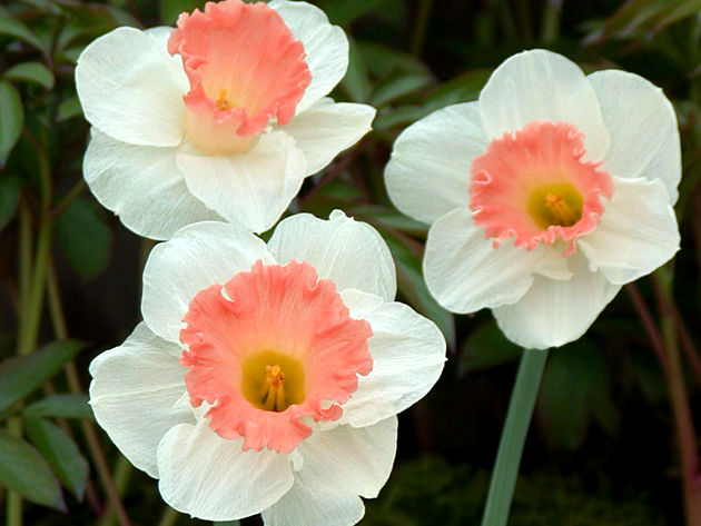 Их дивный весенний аромат и нежный притягательный цвет создадут настроение даже в пустой комнате или заброшенном саду. Розово-лососевая коронка внутри и лепестки цвета пломбира- вот скромная составляющая этого удивительного цветка. Крупный бутон в диаметре 8 см расположился на стеблях длиной в 35-40 см, окружает их прикорневая густая листва. Расцвет нарциссов Pink Parasol наступает в марте-апреле.