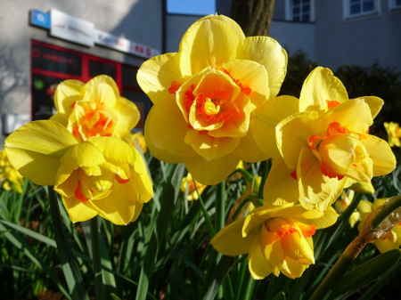 Цветет нарцисс Таити в средние сроки, апрель-май, и достаточно долго. Цветоносы небольшие, около 30-40см. Венчик махровый, с гофрировкой невысокой короны, размером 10-11см. Лепестки теплого желтовато-оранжевого цвета, на короне есть красные вкрапления. Аромат сладкий и достаточно сильный.