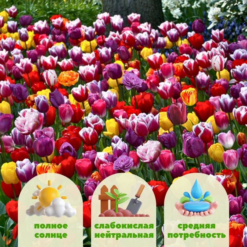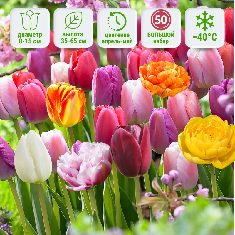 Такой микс станет настоящим фейерверком весны: сад засияет десятками оттенков от кремово-розовых до насыщенно-бордовых и солнечно-жёлтых. Каждый цветок в этом наборе — проверенный сорт, известный своей стабильностью, крупным бутоном и надёжным цветением год за годом. В набор входят 50 луковиц тюльпанов высшего качества, отобранных вручную. Вы получите смесь из сортов средней и поздней группы, чтобы цветение продолжалось максимально долго — с апреля до конца мая. Среди них — классические крупноцветковые тюльпаны, пышные махровые сорта с густыми бутонами, а также двухцветные разновидности, создающие эффект художественной росписи. Все растения устойчивы к весенним перепадам температуры, не выгорают на солнце и подходят для выращивания как в открытом грунте, так и для срезки в букеты.Универсальность и применение в саду: