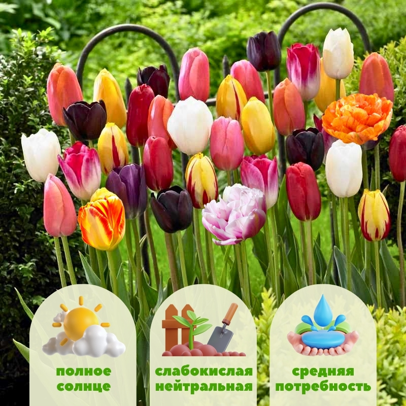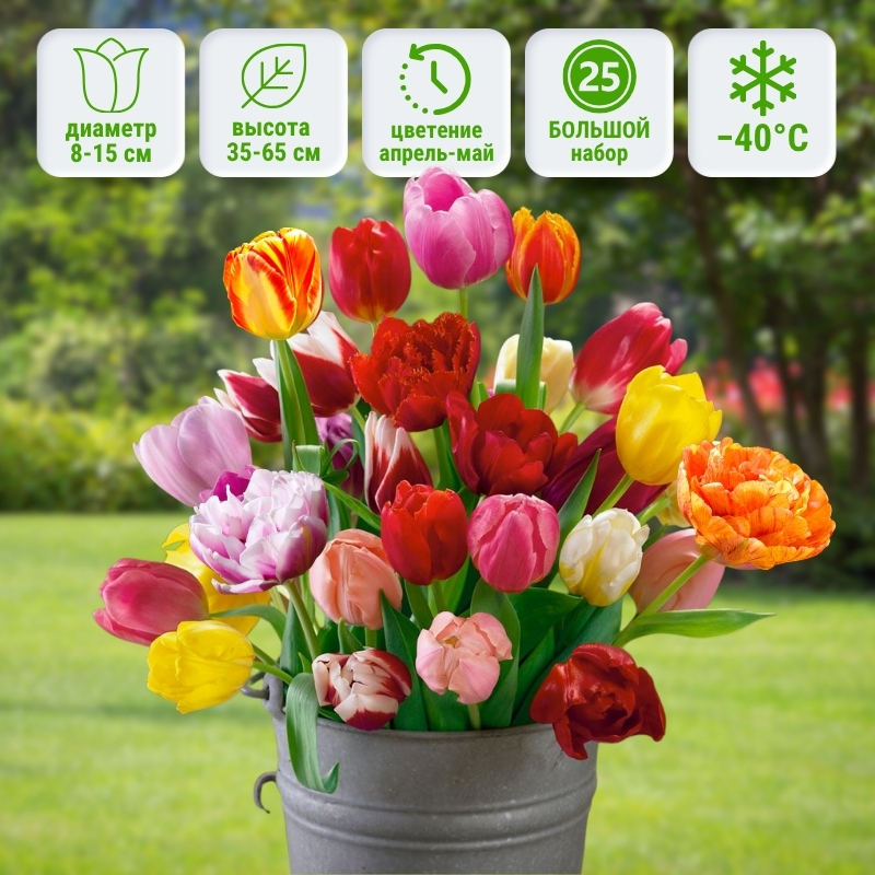 В набор включены 25 луковиц тюльпанов, состоящих из 4х и более сортов различных форм и расцветок — от классических стройных бокалов до пышных махровых пиончиков и эффектных двухцветных вариаций. Цветение растянуто по срокам, так как в набор входят разные группы тюльпанов, что позволяет продлить весенний праздник в саду. Все сорта хорошо адаптированы к российскому климату, устойчивы к выгоранию и непогоде, не требуют сложного ухода и одинаково хорошо смотрятся как в клумбе, так и в контейнерных посадках.Универсальность и применение в саду: