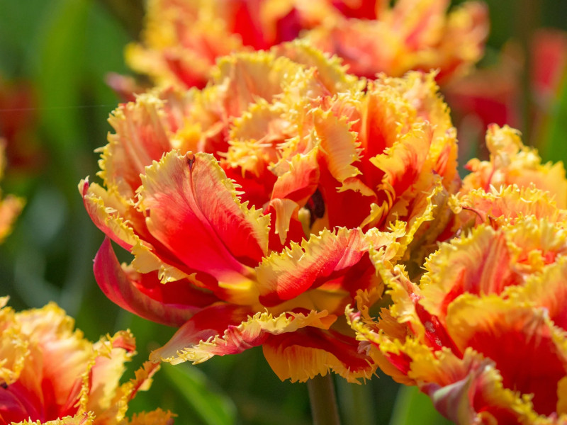 Период цветения тюльпана Криспион Бьюти приходится на май, образуя восхитительно крупные бутоны ярко-красного оттенка с эффектной ярко-желтой густой, игольчатой бахромой по кончикам лепестков. Верхние лепестки зелено-красные. Диаметр цветка при роспуске 10-15 см, аромат дивный сладкий, мягко распространяется по всему саду в безветренную погоду. Продолжительность цветения одного бутона 10-14 дней, цветет многочисленными бутонами. Высота тюльпана Crispion Beauty достигает 40-50 см, с широкими темно-зелеными листьями. Легко размножается, дает прекрасную срезку.