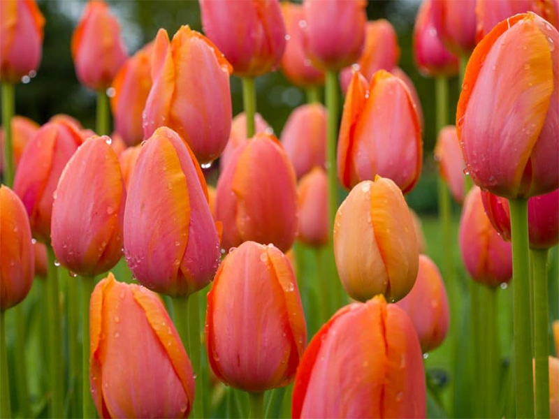 Период цветения тюльпана Дордогне приходится на апрель, образуя крупные бутоны, классической формой бокала высотой 8-9 см. Оттенок лепестков переходит от нежно-розового с абрикосово-оранжевой каймой по краям. Диаметр цветка 10-15 см с дивным сладким ароматом. Продолжительность цветения одного бутона 8-10 дней. Благодаря большому количеству бутонов, тюльпаны этого сорта длительное время украшают клумбу привлекая взгляд. Высота очаровательного тюльпана Dordogne достигает 40-60 см с темно-зелеными прикорневыми листьями сизого оттенка.| Луковицы Дордогне, используют для выгонки, срезки в групповой посадке с другими представителями, в последнее время очень модно стало высаживать тюльпаны в композицию альпийской горки. Восхитительно выглядит клумба с контрастным сочетанием сортов. Дополните тюльпан Дордогне сочными нарциссами, и разбавьте этот микс обворожительными мускари, которые создадут идеальный по красоте низкий фон для высокорослых тюльпанов. Максимально декоративного эффекта Вы добьетесь при высадке луковичных плотно друг к другу по 15-20 шт луковиц каждого вида. |