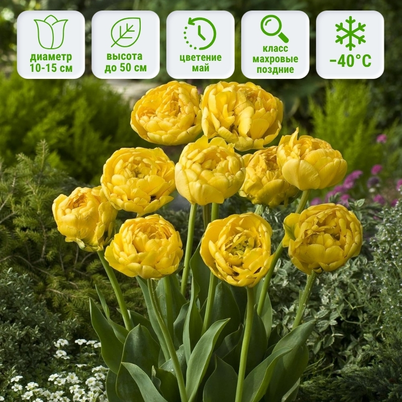 В моменте, когда все ваши роскошные тюльпаны будут завершать цветение, последнее слово оставьте за данным сортом! Махровый поздний тюльпан Еллоу Помпонет (Yellow Pomponette) расцветает объёмными шаровидными цветками яркого канареечного цвета и задает тёплое и жизнерадостное настроение на клумбе.
