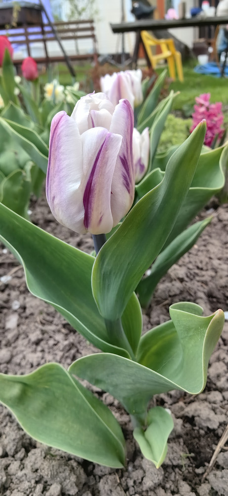 Красивый бело-вишневый цветок тюльпана возвышается на прочной ноге, высотой до 45 см.