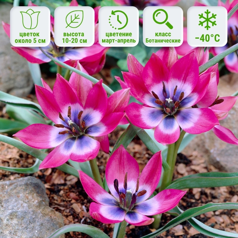 Распускается тюльпан Little Beauty в мае-июне образуя на прочном цветоносе высотой от 20см до 30 см красные рыхлые бутончики высотой около 5см. Когда лепестки расходятся в виде звездочки, становится заметной их удивительная окраска – у основания темно-синяя, переходящая в розовую, а затем в красный оттенок. Продолжительность цветения 10-12 дней благоухая нежным, сладким ароматом. Листья прикорневые, узкие темно-зеленого оттенка, что придает кусту оригинальность.