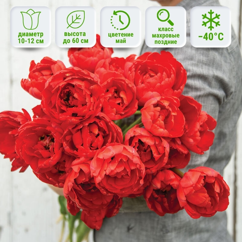 Это махровый поздний сорт тюльпана, известный своими большими и густыми цветками, диаметром до 12 см (бокал до 7 см высотой). Лепестки этого сорта имеют яркий алый цвет, который сохраняется на протяжении всего периода цветения. Высота растения достигает 40-50 см, что делает его подходящим как для садовых композиций, так и для срезки. Цветение начинается в конце апреля и продолжается до начала мая, радуя своей красотой в течение нескольких недель. Зимостойкость -40°C.Где в саду высаживать и с какими растениями использовать