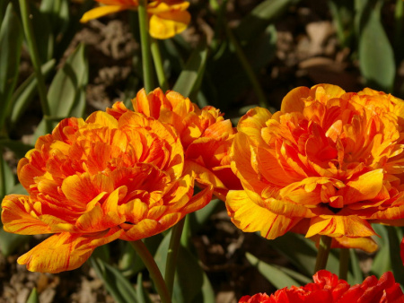 Тюльпан Монте Флейм относится к махровым поздним сортам (класс DL). Цветет тюльпан Monte Flame в конце мая, образует золотисто-жёлтые лепестки, по которым словно пламя, разбегаются красные "язычки". Донце тюльпана чёрное, высота бокала до 8 см. В раскрытом виде цветок достигает в диаметре 10-12 см, с нежным сладким запахом. Продолжительность цветения - до 2-3 недель. Особое отличие - цветы этой группы имеют большое количество лепестков. За сходство строения цветка с пионами такие тюльпаны называют пионовидными, этот сорт достойно украсит Ваш сад. Обладает тюльпан Монте Флейм средней скоростью роста, подходит как для озеленения и украшения клумб, так и для букетов, отлично растет на хорошо освещенном месте и в полутени. Красивый и яркий цветок тюльпана Монте Флейм возвышается на крепкой ноге, высотой 35-45 см.