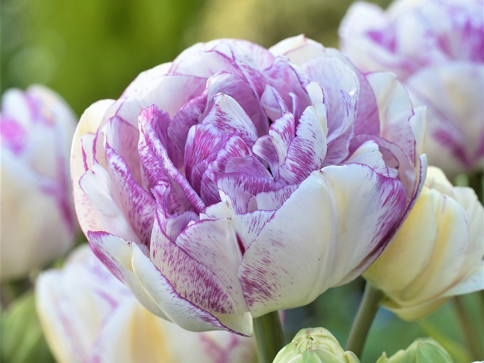 Восхитительный тюльпан Нормандия относится к группе махровые поздние, период цветения приходится на май, образуя роскошные, пышные цветы белоснежного оттенка с нежно-фиолетовыми штрихами по краям нежных лепестков. Высота бокала 6-8 см, а диаметр при роспуске 10-12 см. Продолжительность цветения 8-10 см источая нежный, тонкий аромат. Высота тюльпана Normandie достигает 40-50 см, стебель прочный, прямой, что позволяет держать на высоте крупный цветок.