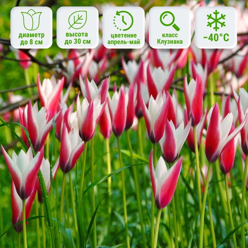 Благодаря компактному размеру и изящному облику, его можно использовать в контейнерах, создавать природные композиции или высаживать куртинами в газонах. Он гармонично смотрится рядом с мускари, примулами, сциллами и другими ботаническими тюльпанами. Это отличный выбор для тех, кто хочет добавить в сад яркости, не нарушая гармонию природного стиля. Tulipa Clusiana Peppermint Stick идеально подходит для посадки в рокариях, альпийских горках, бордюрах и переднем плане цветников.Рекомендации по посадке и уходу: