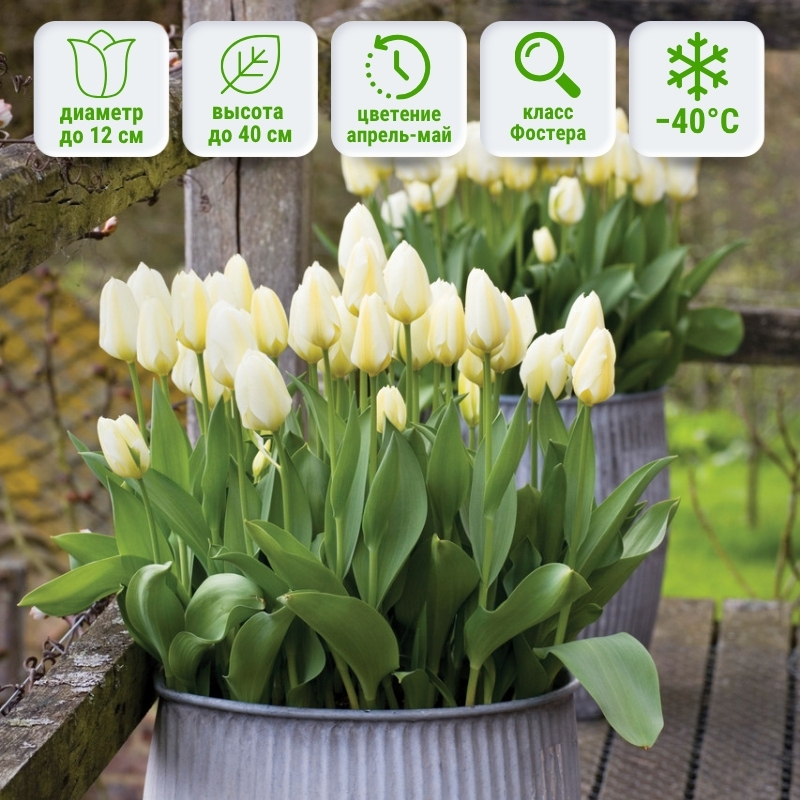 Благородная палитра tulipa Purissima делает его отличным выбором для моноцветников, бордюров, оформления парадных клумб. Особенно эффектно он смотрится в композициях с ранними мускари, синими анемонами, морозниками и декоративными травами. Также подходит для выгонки и срезки — долго стоит в букете. Благодаря плотному стеблю и крупному цветку тюльпан сохраняет форму даже в ветреную погоду и не требует подвязки.Рекомендации по посадке и уходу: