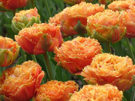 Тюльпан Сенсуал Тач относится к бахромчатым сортам (класс FR). Цветет тюльпан Sensual Touch в конце мая, образуя насыщенный пышный желто-оранжевый цветок, с красивой и изящной бахромой на кончиках лепестков, высота бокала 8 см диаметр 10-15 см. Отличительная особенность этих тюльпанов - игольчатая бахрома по краям лепестков, напоминающая иней. Как бы то ни было, бахромчатые тюльпаны всегда производят неизгладимое впечатление. Обладает тюльпан Сенсуал Тач средней скоростью роста, подходит как для озеленения и украшения клумб, так и для букетов. Красивый желто-оранжевый цветок возвышается на прочной ноге высотой 50 см. Легко размножается, дает прекрасную срезку.