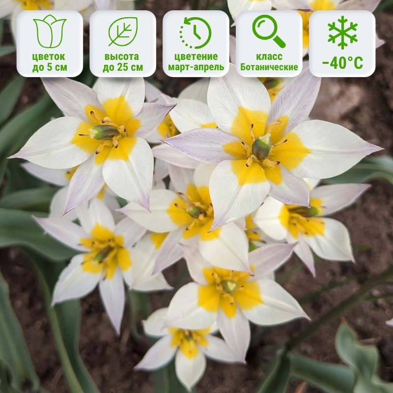 Миниатюрный ботанический тюльпан высотой около 15–25 см. Цветки звездчатые, с кремово-белыми лепестками и жёлто-оранжевым центром. Из одной луковицы появляется несколько цветоводов, каждый из которых может нести до 4х бутонов, раскрывающихся в ясную погоду. Цветки небольшие по 5 см в диаметре, обладают достаточно сильным, для тюльпанов, ароматом. Цветение раннее с конца апреля по май, продолжительное. Листья серо-зелёные, узкие, с восковым налётом. Отличается высокой зимостойкостью до –40°C, прекрасно переносит российские морозы.Универсальность использования в саду: