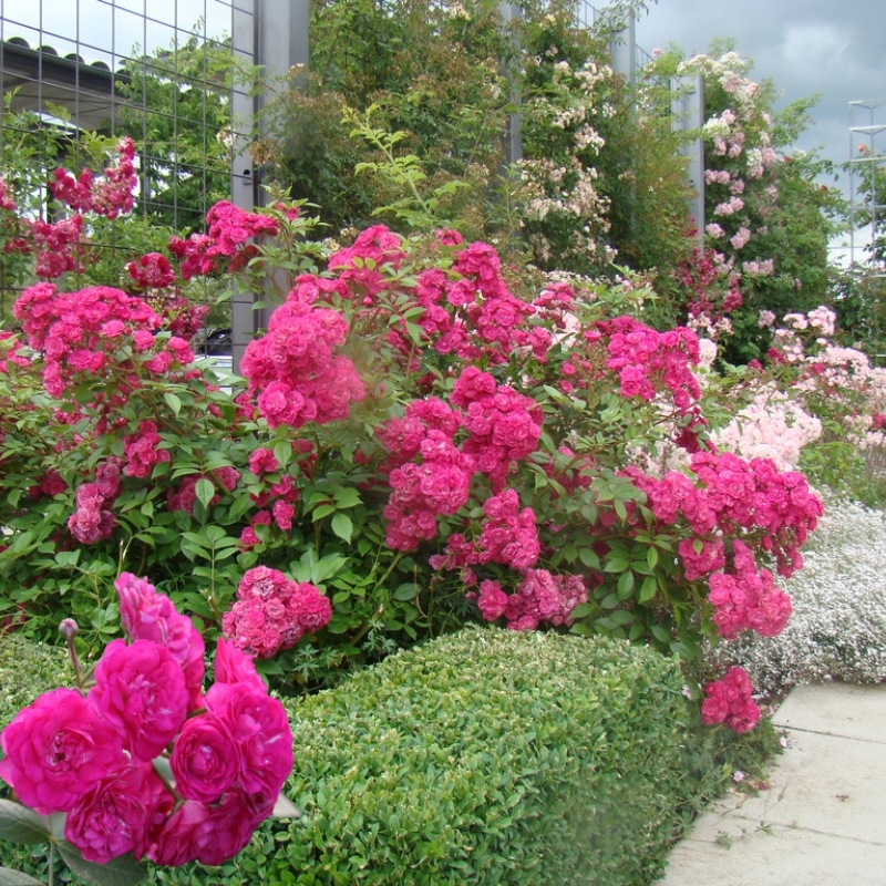 Бутоны умопомрачительного цвета фуксии собраны в объёмистые шаровидные соцветия. На каждом побеге 5, 10, 15 цветочков, каждый диаметром всего в 5 см. Тонкий аромат цветущего растения привлекает пчёл. Цветки полумахровые, полностью раскрываются, обнажая тычинки. Роза Динки идеальное украшение переднего плана клумб! Цветы попеременно сменяют друг друга так, что ни летом, ни осенью Вы не увидите, как эта трудяжка отдыхает. Сорт не самоочищающийся, поэтому необходимо вовремя удалять неприглядный гербарий.