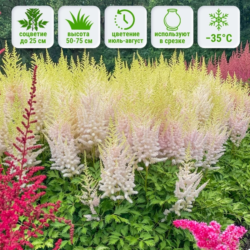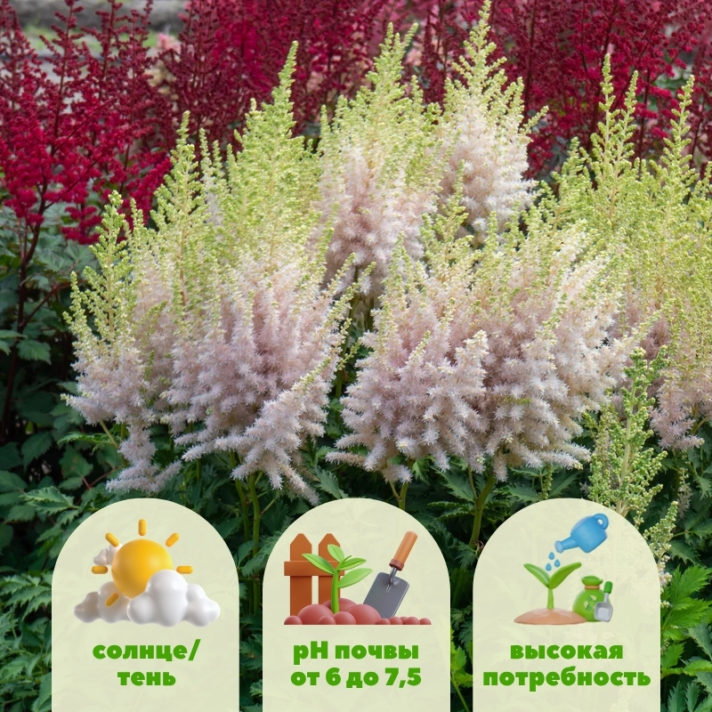 Для посадки астильбы выбирайте полутенистое или теневое место с рыхлой, богатой гумусом почвой и стабильной влажностью. В регионах с прохладным летом можно выращивать на открытом солнце. Это растение не переносит пересыхания, почва должна оставаться слегка влажной, особенно в жаркий период. Идеальны участки у водоёмов, под кронами деревьев или рядом с теневыносливыми многолетниками. Почва — слабокислая или нейтральная, хорошо дренированная. Весной рекомендуется мульчировать посадки перегноем или корой, чтобы сохранить влагу и улучшить структуру грунта. Подкормки вносят 1–2 раза за сезон: весной — азотные, перед цветением — калийно-фосфорные. Осенью надземную часть срезают, оставляя корневище зимовать в грунте — сорт полностью зимостоек и не требует укрытия.Доставка астильбы Milk and Honey осуществляется с помощью услуг почты России и транспортных компаний, возможна доставка авиа-почтой и курьером.