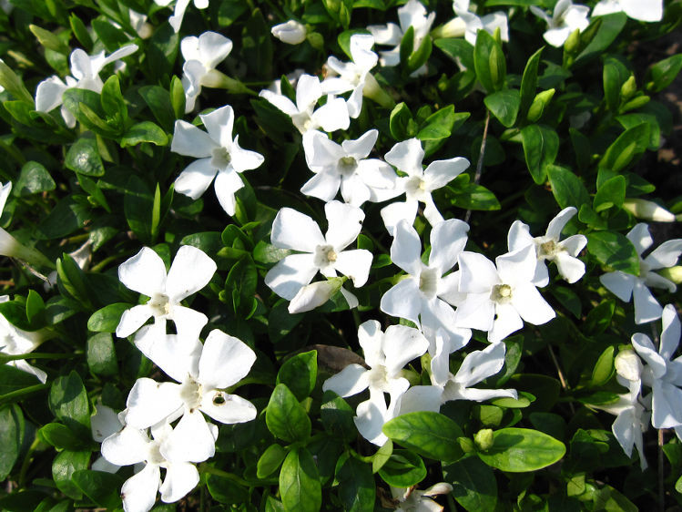 Барвинок белый универсален. В саду найдется не одно местечко, где он бы прижился, ненавязчиво украшая полянку, бордюр, основание декоративного дерева или ярусный декоративный палисадник. Из себя куст барвинка представляет собой невысокое растение до 20 см высотой, из корня расползаются тонкие побеги, густо облепленные сочного цвета зеленью, которая с по истечением времени становится более темной. Под нежным майским солнцем зацветают сотни белоснежных крохотных цветков. Они простой формы, состоят из 5 шт лепестков диаметром всего в 2-3 см.