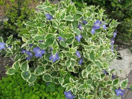Барвинок пестролистный - находка для тенистого участка. Густой ковер служит не только украшением, но и самым простым способом декорирования территории - посадил и забыл. Его скромный рост всего 15 см. Зацветает данный почвопокровник в конце весны фиолетовыми цветками. Скромные в размере они всего 2-3 см в диаметре, состоят из 5 шт лепестков. Остальное время (кроме зимнего) барвинок наполнен листьями. Размножается самостоятельно, укореняя стебли в приземлившихся узлах, также черенкуется.