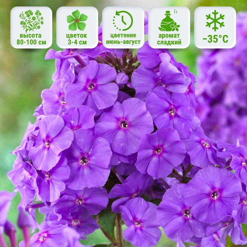 Благородный цвет играючи меняет оттенки на солнце. Утром флокс Аметист насыщенный пурпурный, днём добавляются небесного цвета тона, превращая цветок в голубовато-лиловый. Цветочки диаметром до 3,8 см собраны в плотные соцветия овально-конической формы. Не стоит беспокоится о том, что цветок быстро потеряет свою красочность, сорт флокса Ametist не выгорает, потому будет продолжительное время радовать Вас.