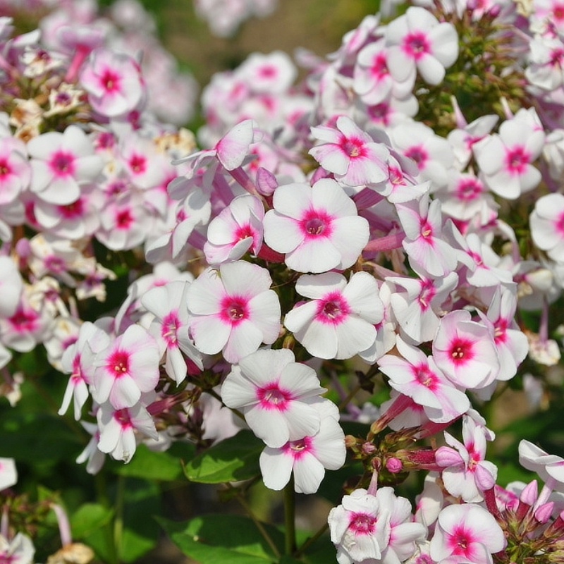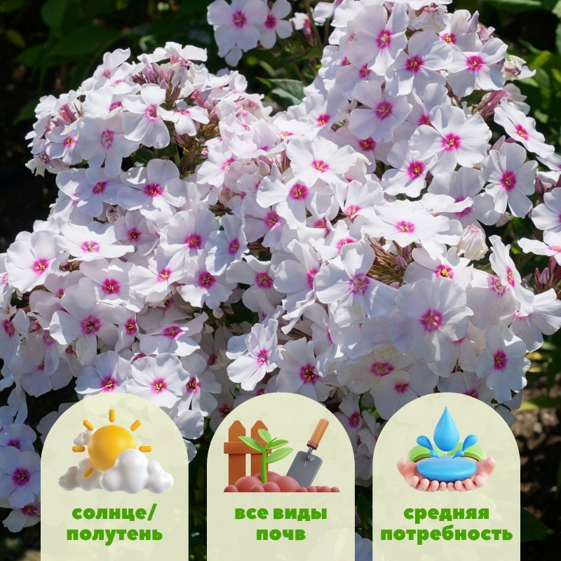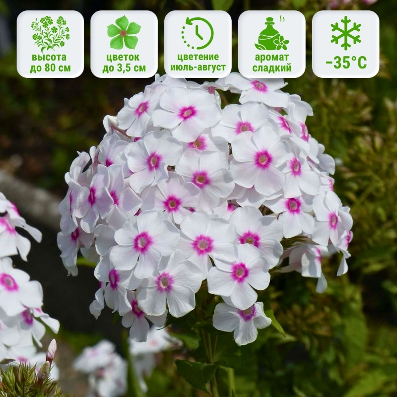 Флокс достигает высоты 80 см, образуя прямостоячий куст с большими соцветиями диаметром до 20 см. Цветы излучают чистый белый цвет с насыщенным малиновым центром, что делает их особенно выразительными. Диаметр одного цветка 3-3,5 см. Цветение начинается в июле и продолжается до сентября, радость от красоты растения длится всё лето. Флокс обладает тонким сладковатым ароматом, который привлекает бабочек и создаёт особую атмосферу сада. Зимостойкость высокая -35°C, что делает его подходящим для большинства регионов.Универсальность в саду: