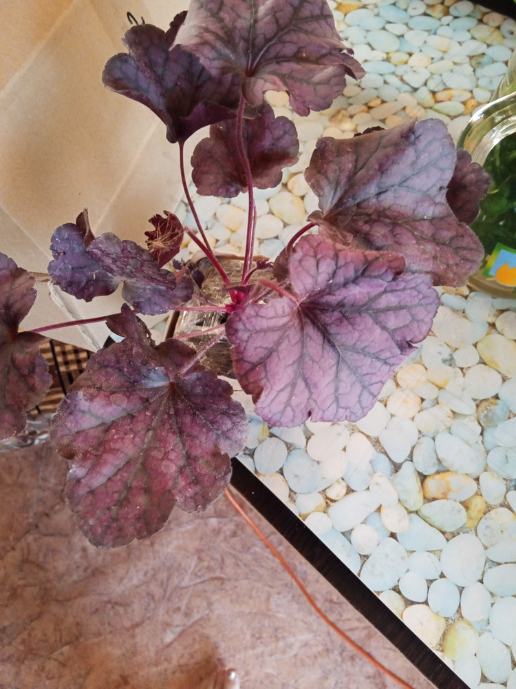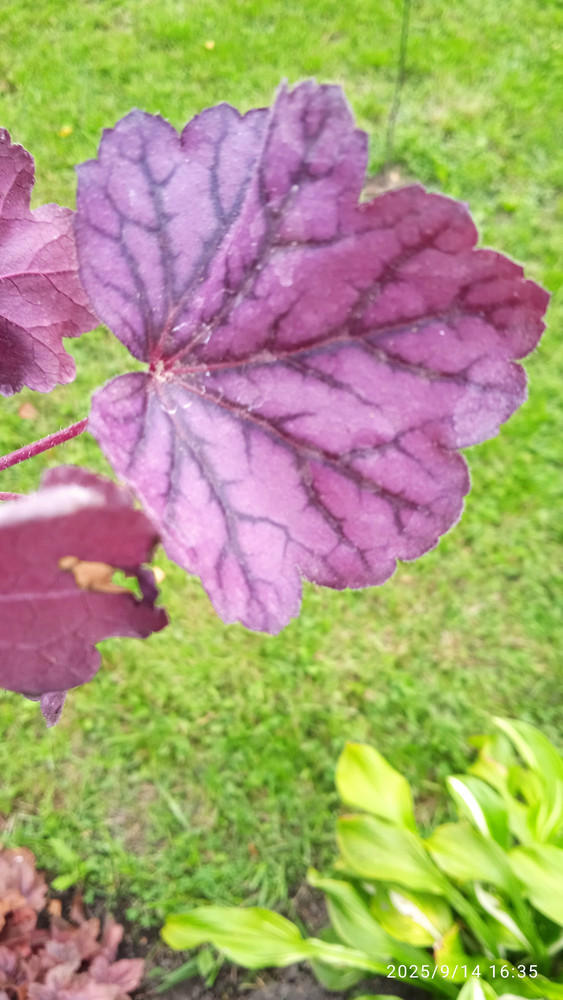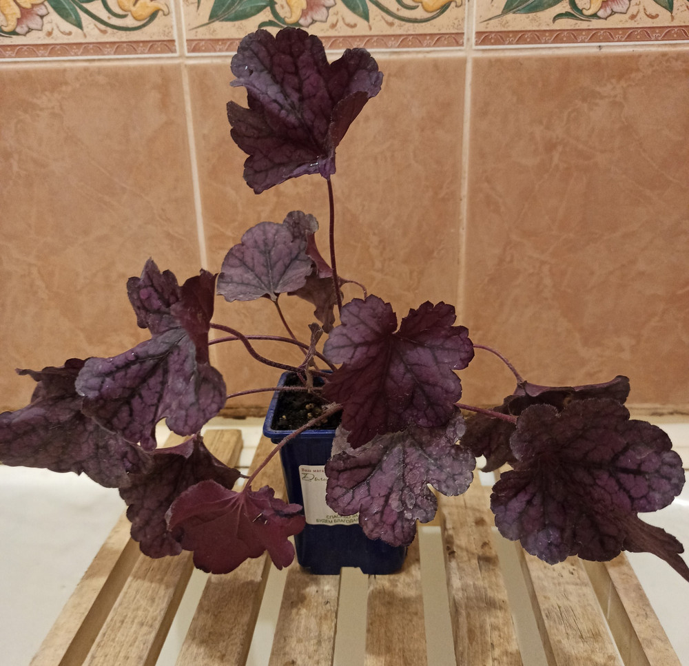 Образует плотный кустик высотой 30 см и шириной до 55 см. Листья насыщенного фиолетово-пурпурного цвета с глянцевой поверхностью и волнистыми краями, сохраняют окраску в тени и на солнце. Цветёт в июле-августе, выпуская розово-лавандовые цветки-колокольчики на бордовых цветоносах. Зимостойкость до -29°C. Почти не болеет и не имеет серьезных вредителей.Универсальность использования в саду: