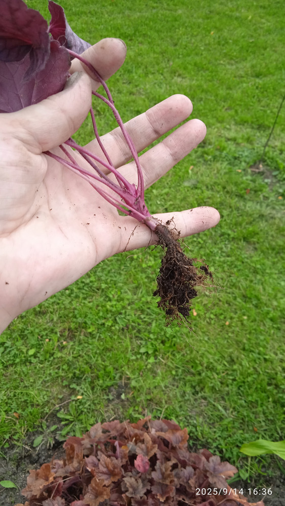 Если растение начало оголяться, то оно делится на несколько частей и высаживается. Процедура проводится в начале весны. Перед посадкой черенка в ямку 30*30 см добавляется компостное или минеральное удобрение. Как нарастут корешки (1-1,5 месяца), саженцы гейхеры высаживаются на постоянное место.