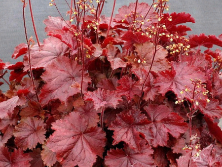 Никакой игры оттенков, только стойкий, глубокий, привлекательный красно-терракотовый цвет. Вы такой её увидите весной и точно такой же проводите глубокой осенью. Гейхера Форевер Ред имеет красивый резной лист, похожий на кленовый. В солнечное время красиво поблескивает. Цветёт с середины июля до сентября, цветки белые, мелкие, в рыхлых соцветиях на подобии метельчатых. Они эффектно контрастируют на фоне рубиновой листвы. Максимальная высота взрослого куста 30 см, в ширинупримерно столько же.