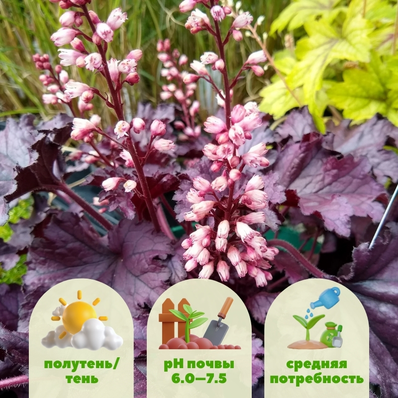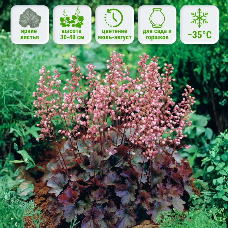 Гейхера Кассис — это компактное, элегантное растение, которое легко впишется в любую садовую композицию. Высота куста достигает 25-30 см, а во время цветения — до 40-50 см. Мелкие бело-розовые цветы появляются в июне-июле, но главная ценность растения — это его выразительная листва, сохраняющая декоративность круглый год. Этот вечнозеленый многолетник меняет наряды по сезонности: весной лист бронзово-коричневый, а осенью уже более яркий с насыщенными красными нотками. Наиболее насыщенная сторона листа тыльная. Гейхера устойчива к заморозкам до -35°C, что делает её отличным выбором для регионов с холодными зимами.Применение в саду