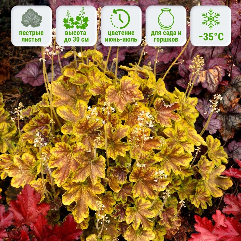 Что привнесет гейхера Солар Эклипс в ваш сад? Краски! Это наиболее эффектное и выносливое растение, которое бушует своими красками с ранней весны по глубокую осень. Дело в том, что гейхерелла уходит в зиму с не отмершей наружной частью, так как является вечнозеленой, поэтому и наблюдать её декоративность вы можете максимально долго. Листья крупные, волнистые, коричнево-красные с яркой желта-зеленой каймой. Интенсивность цвета и ширина каймы могут видоизменяться в разный вегетационный период. В июне-июле сорт цветет колокольчиковидными белыми цветами в небольших соцветиях.