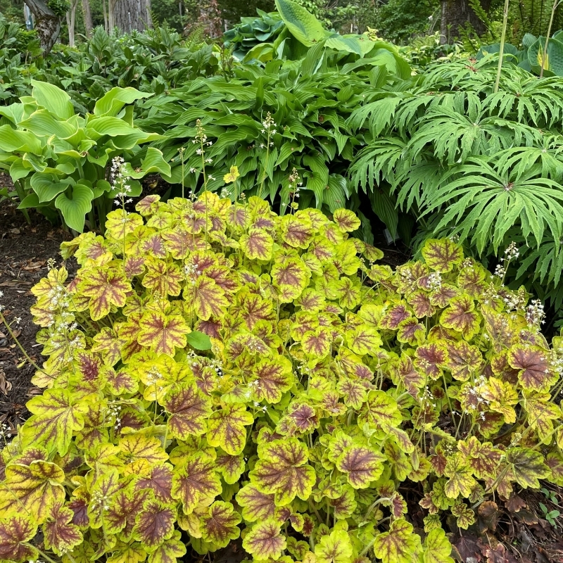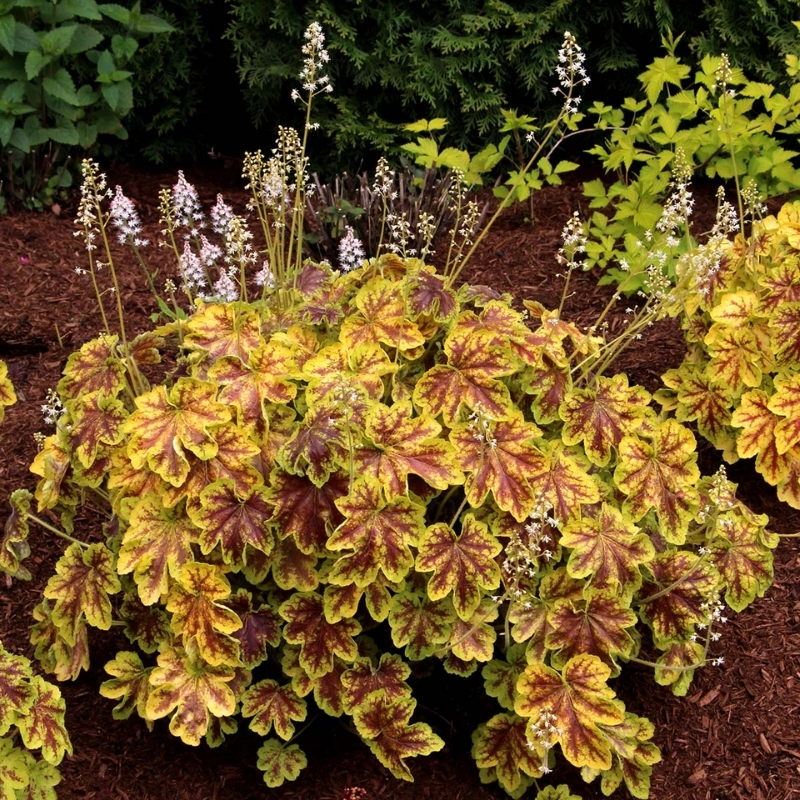 Пушистый куст гейхереллы Solar Eclipse имеет природную полуокруглую форму, которую достойно держит во все сезоны. Он весьма компактный (30 см высотой и 40 см шириной), что умещает его даже не самых маленьких клумбах. Лучше всего гейхерелла смотрится в группе. Можно использовать как один сорт, если вы выдерживаете какую-либо цветовую гамму, так и смесь сортов с привлечением гейхер и тиарелл. Гейхерелла Солнечное затмение считается очень выносливым сортом с зимостойкостью до -35°C. Может поражаться слизнями.