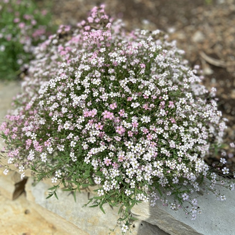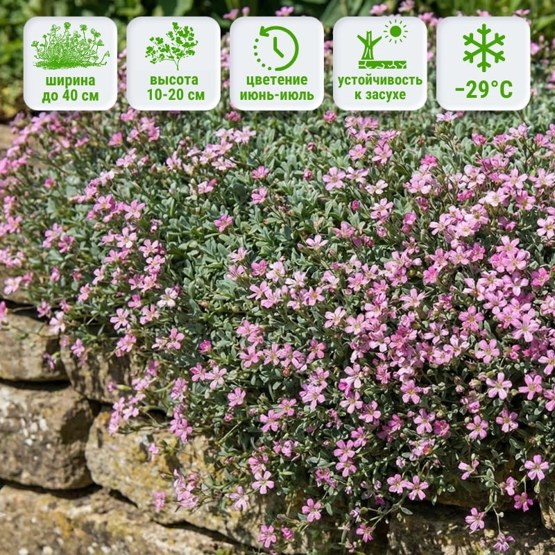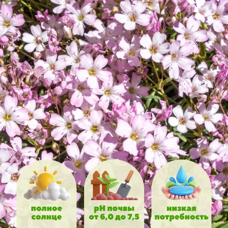 Главной достопримечательностью этого растения является его ненавязчивая и пористая структура, которая легкой воздушной периной покрывает садовые бордюры и рокарии. Отдельные бутончики не имеют высокой ценности, они простой формы и размером менее 1го см. Но встретившись с их обилием, вы сразу же понимаете всю декоративность, которую они привносят в сад. В цветущем виде гипсофила ползучая розовая пребывает более одного месяца. Первые цветочки появляются в июне и исчезают с куста в июле, возможно спорадическое повторное цветение в конце сезона. Как идея - вы можете миксовать посадки гипсофилы и флокса шиловидного, чтобы цветение было более продолжительным. Флокс ползучий расцветает достаточно рано весной, на юге его можно застать уже в конце марта.Этот низкорослый многолетник обычно достигает высоты 15-20 см и разрастается на 40 см в стороны, образуя плотный коврик листвы. Его раскидистый габитус и узколанцетная листва придают растению нежную, плавную эстетику, делая его идеальным выбором для смягчения жестких границ и заполнения пробелов романтичным оттенком. Известное своей отличной зимостойкостью, gypsophila repens rosea выдерживает температуры до -29°C.