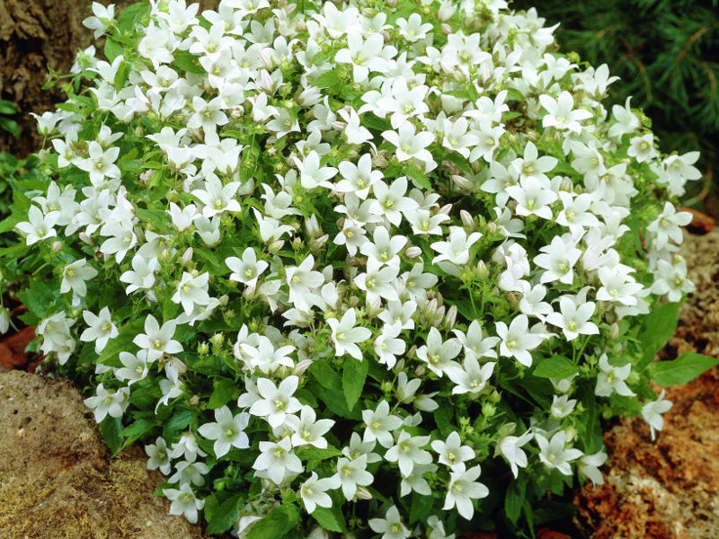 Чтобы Ваши цветочки дольше Вас радовали, удаляйте с куста отцветшие бутончики, тогда повторная волна цветения будет более обильная. Чем ещё может удивить колокольчик White Pouffe? Он абсолютно не прихотлив к почвам, не болеет и выдерживает морозы до -29 градусов. Весьма изящное растение имеет хорошую устойчивость к дождю, куст немного распадается, но тем не менее выглядит привлекательно. Посадив этот цветок, Вы будете задаваться вопросом, как раньше были без него? Рабатки, миксбордеры, вазоны, рокарии- можно до бесконечности перечислять места, где можно высадить колокольчик Уайт Пуфф.