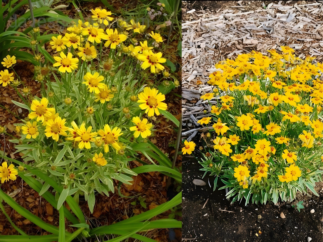 Название ”вариегатный” нам декламирует, что мы столкнулись с красивой пестролистной вариацией. Обычная зелень заменена изумрудным листом с бело-кремовым кантом. Форма ланцетная, сам лист не очень крупный, но многочисленный и формируется в основании побегов. Из густого пучка выстреливают тонкие и длинные стебли, которые всё лето и часть осени усыпаны ромашками желто-лимонного цвета. Тычиночный центр их махровый на тон темнее основного цвета. Лепестки по внешнему краю зубчатые, а у основания своего имеют вишневый глазок. Чем чаще вы вычищаете куст от сухих головок, тем больше и дольше кореопсис variegata цветёт. Высота этого декоративного куста всего 40 см (реже выше), цветки в диаметре 6 см.Выбрав вариегатный кореопсис к себе в сад вы ни дня не пожалеете. Во-первых, это не агрессивное растение, которое не станет конкурировать с другими цветами вашего сада. Во-вторых, оно любит открытое и даже южное палящее солнце. В-третьих, он прост в выращивании, особенно если у вас плодородная земля без застоев воды, то выражение ”посадить и забыть” тут полностью себя оправдывает. В-четвертых, он и правда очень долго цветет, даже если вы не будете успевать очищать его от сухоцвета, в зелени листьев всегда будут присутствовать цветы. В-пятых, кореопсис вариегатный это абсолютно выносливое зимостойкое растение, которое не нужно укрывать до -29℃. Не упустите возможность завладеть этим сокровищем садового царства!