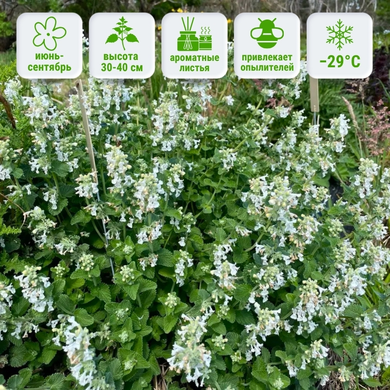 Компактный многолетник высотой около 30-40 см и шириной до 40–50 см, образующий аккуратные, густо облиственные подушки. Цветки мелкие, снежно-белые (Snowflake в переводе означает ”снежинка”), собраны в соцветия-колоски, которые буквально покрывают растение с июня по сентябрь. Листья серо-зелёные, слегка опушённые, источают приятный пряно-мятный аромат, особенно заметный в солнечную погоду. Белая кошачья мята Сноуфлейк отличается высокой засухоустойчивостью и зимостойкостью до -29°C.Универсальность и применение в саду