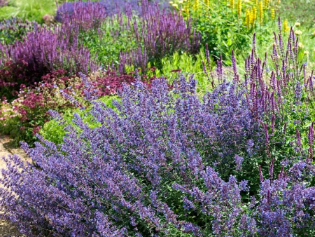 Перенимает эстафету фиолетового цветения лаванды и пускается в цвет с середины лета по сентябрь. Цветки мелкие в рыхлых соцветиях, покрывают не менее половины размера побега. Когда они увядают следует обрезать сухоцвет, чтобы привести в порядок куст и не растрачивать его силы, а направить на укрепление корней. Серебристо-зеленые листья с мягким тёплым ароматом, особенно летучим и растворяющимся в воздухе при прикосновении. Не смотря на название (low переводится как низкий), это достаточно крупный и размашистый кустарник высотой до 50 см и шириной около 90 см.ДОСТОИНСТВА nepeta faassenii Walker's Low: