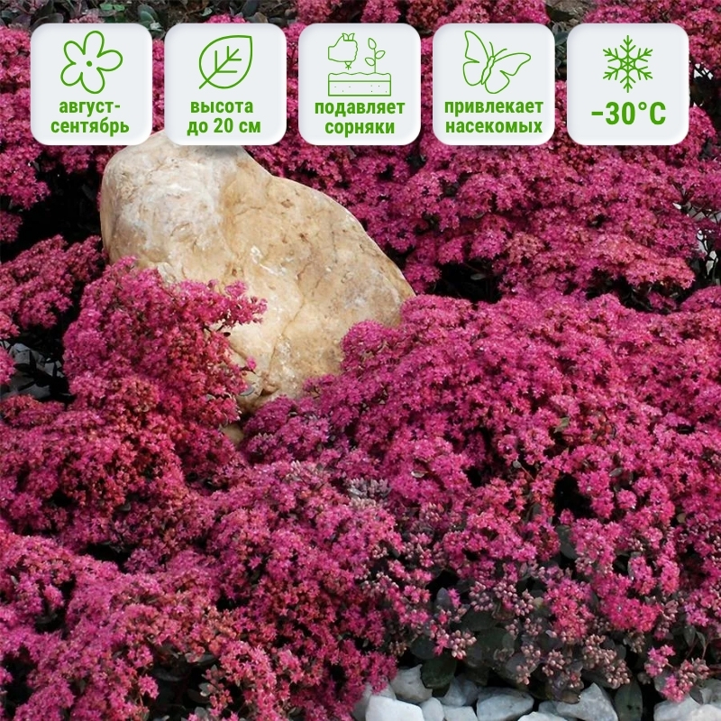 Sedum Sunsparkler Dazzleberry — эффектный многолетний почвопокровник высотой всего 15–20 см и шириной до 45 см, который ценится за густую сизо-голубую листву и впечатляющее цветение. В конце июля–августе над подушкой листвы вырастают плотные соцветия-массивы насыщенного малиново-розового цвета диаметром до 20 см. Наблюдать за цветочным представлением вы будете около 7-ми недель. Жара не портит его красоту, соцветия сохраняют яркость цвета даже в самом солнечном саду. Седум Dazzleberry отличается высокой засухоустойчивостью и неприхотливостью, привлекает полезных насекомых, зимует без укрытия, выдерживает морозы до −35 °C.Универсальность использования в саду: