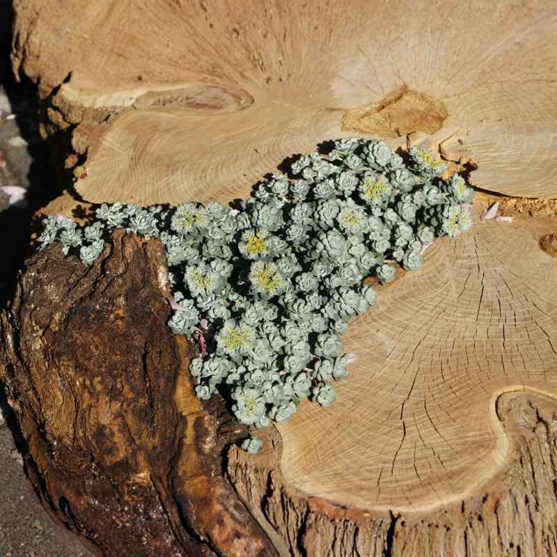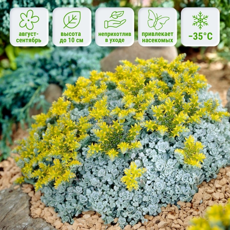 Это вечнозелёный многолетник из семейства толстянковых, достигающий высоты около 5-10 см и 20-30 см ширины. Листья мясистые, лопатчатые, серо-зелёные с серебристым налётом, собраны на концах утолщённых побегов в порядке, формирующем подобие цветка. Цветоносные стебли вырастают до 10 см и увенчаны зонтиковидными соцветиями из звёздчатых жёлтых цветков. В период цветения (июнь-июль) они эффектно контрастируют с холодным оттенком листвы, создавая впечатляющую игру цветов. Растение способно выдерживать температуры до -29 °C, но в бесснежные морозные зимы может вымерзать.Универсальность использования в саду: