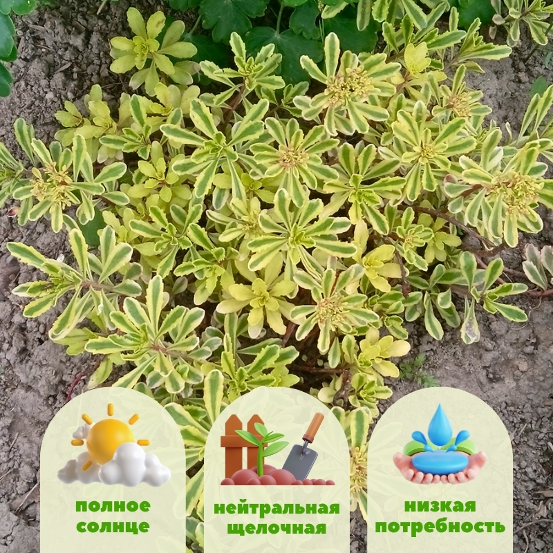 Предпочитает хорошо дренированные умеренно плодородные почвы, но может расти на бедных, песчаных и каменистых почвах. Лучше всего растет на солнечных участках, где проявляет максимальную яркость листьев. Требует минимального полива, устойчив к засухе. Не переносит застой воды. Практически не нуждается в удобрениях, но можно добавить небольшое количество органики весной. Удаление старых и отцветших частей растения для поддержания аккуратного вида.Для отправки корней очитка Миддендорфа Вариегата используется стандартный корень в надежной упаковке, что сделает пересылку безопасной для растения.