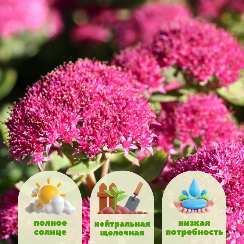 Данный многолетник из семейства толстянковых, образующий плотный, аккуратный куст высотой около 30–50 см и шириной до 40 см. Листья мясистые, слегка зубчатые, 5-7 см длиной, серо-зелёные, овальные, с восковым налётом, создающим эффект свежести даже в жару. Соцветия крупные щитковидные, диаметром около 10 см, собраны из множества мелких звёздчатых цветков ярко-розового или малиново-розового оттенка. Цветёт обильно и продолжительно с конца августа до октября, оставаясь декоративным даже после отцветания. Зимостойкость высокая до -35°C, растение отлично переносит засуху и не требует сложного ухода.Универсальность и использование в саду